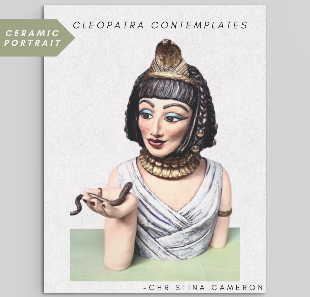 Ceramic portrait titled “Cleopatra Contemplates” (Christina Cameron). Captures Cleopatra poised between love and legend, adorned in gold and lapis hues, reflecting sovereignty and defiance.