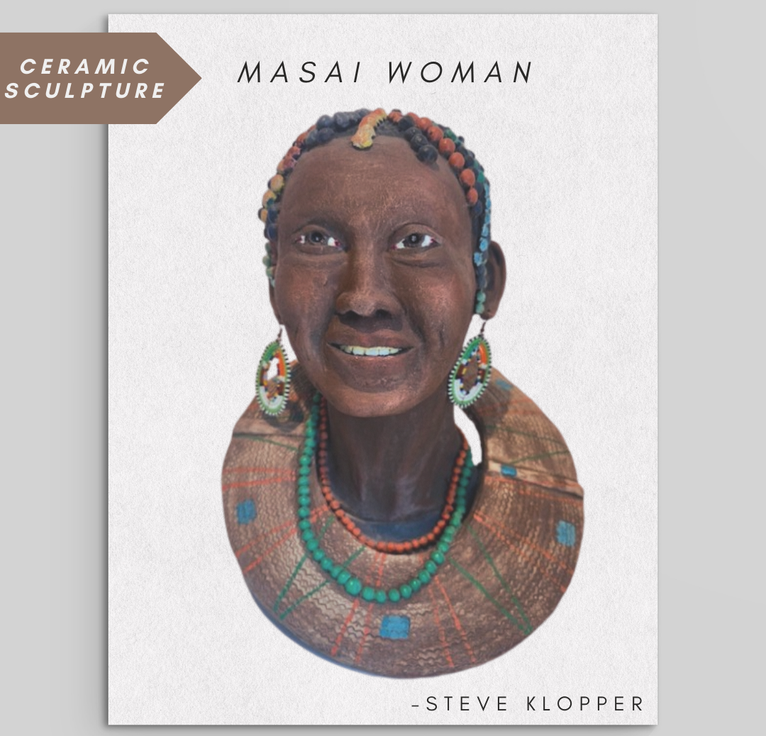 Ceramic sculpture titled “Masai Woman” (Steve Klopper). A testament to the enduring beauty, charm, and creativity of the Masai women, celebrating their artistic energy and cultural richness.