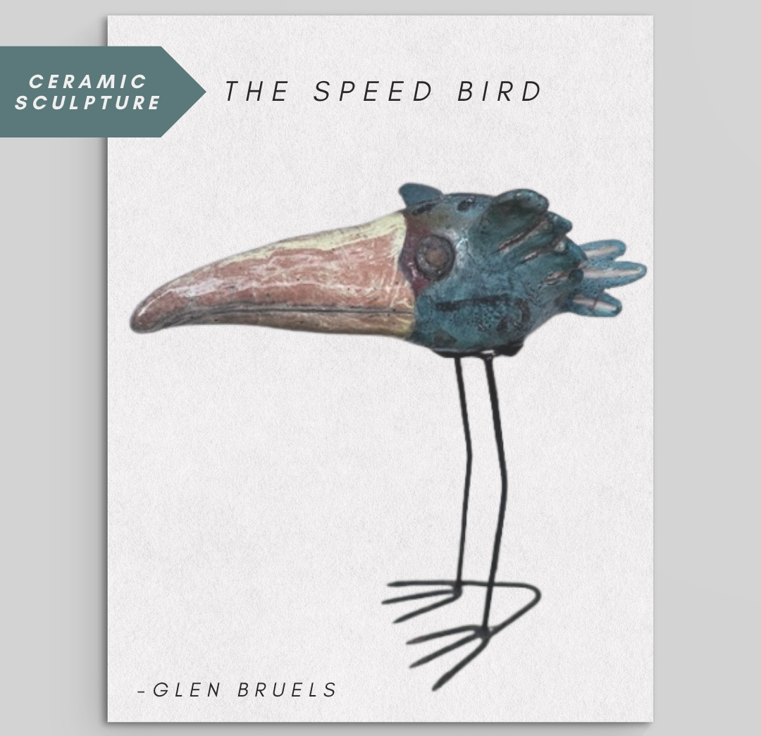 Ceramic sculpture titled “The Speed Bird” (Glen Bruels). A visionary piece showcasing aerodynamic form, elongated beak, and swept-back wings, symbolizing supersonic speed and evolutionary design.