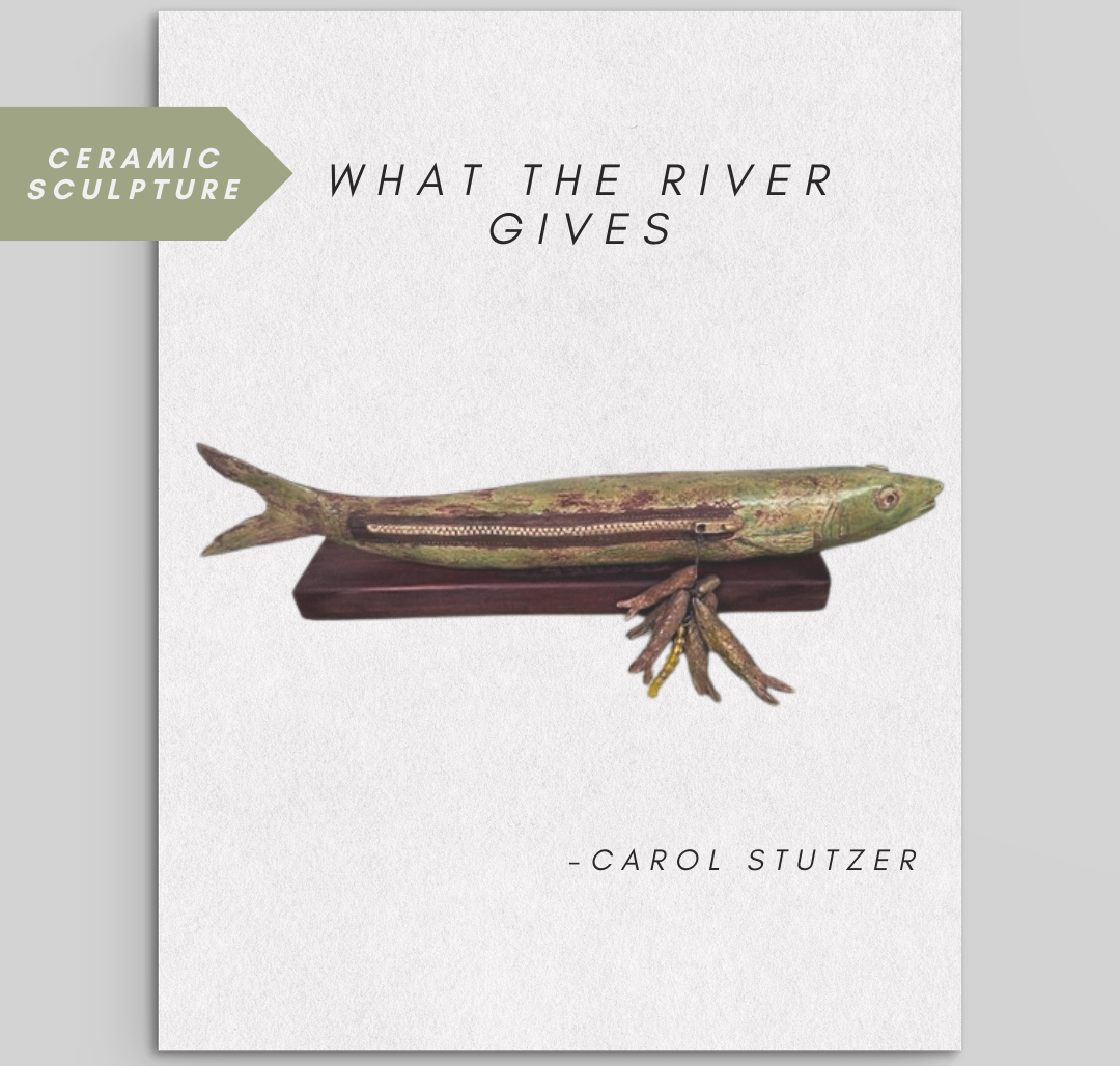 Ceramic sculpture titled “What the River Gives” (Carol Stutzer). A poetic piece featuring fish and golden eggs, symbolizing abundance, care, and the treasures carried along life’s currents.