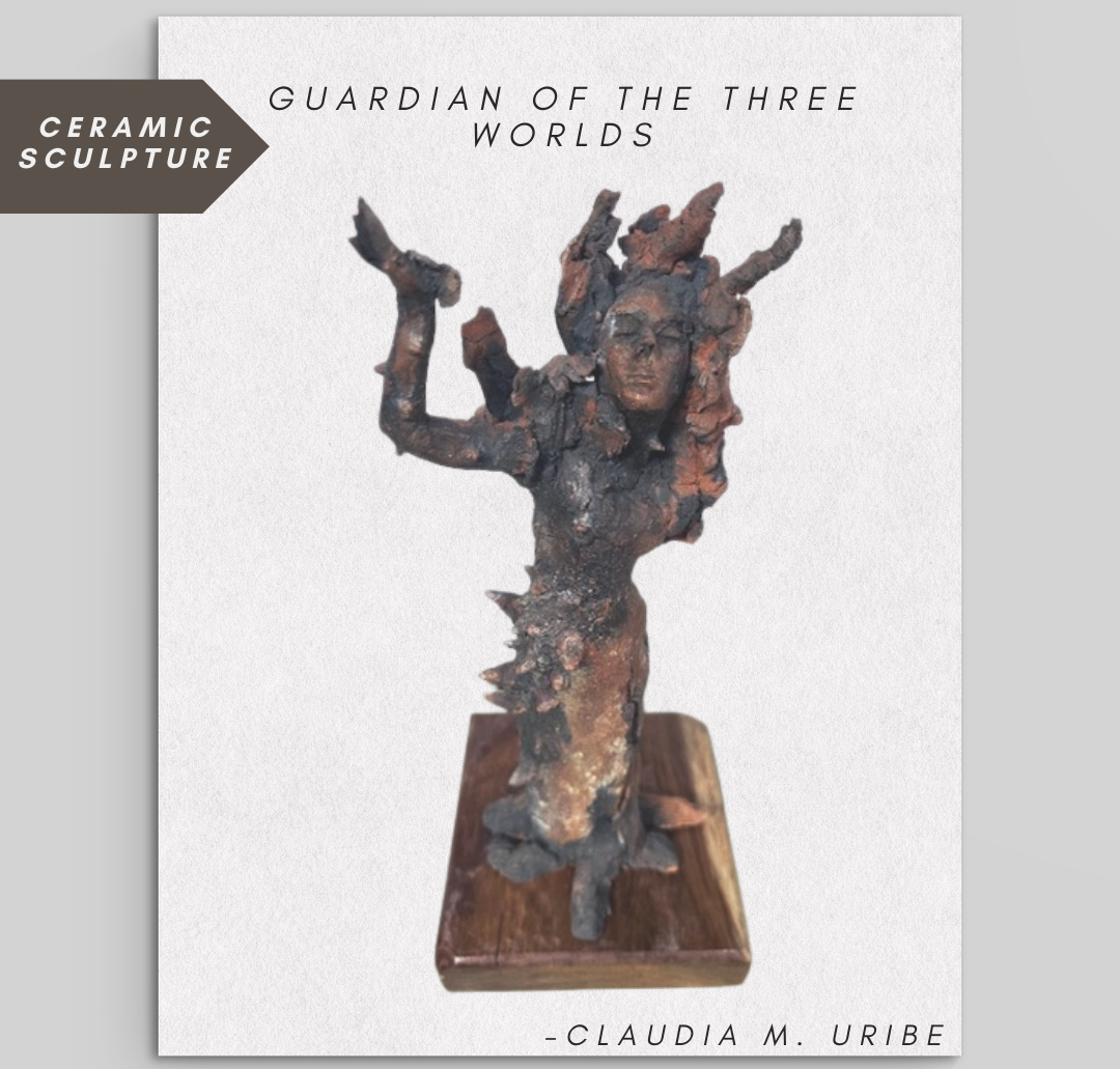 Ceramic sculpture titled “Guardian of the Three Worlds” (Claudia M. Uribe). A mystical piece embodying nature, fire, rain, and the creation of worlds through feminine strength and resilience.